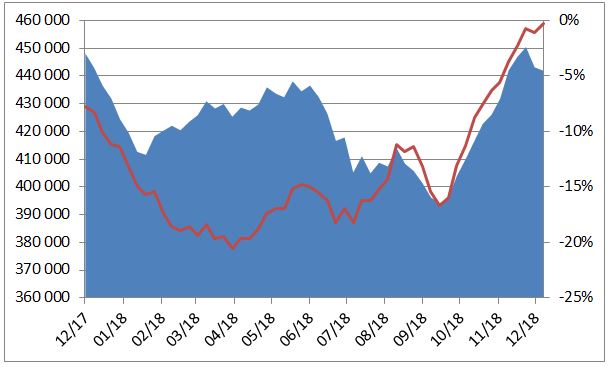Nižšie prezásobenie amerického trhu a pokles ťažby ropy teda aktuálne v kombinácii s rozhodnutím OPECu ukazujú pre cenu ropy viac priestoru pre pokles ako pre rast. S určitým oneskorením tieto dáta zobrali pozitívne aj trhy, pričom Brent sa vrátil nad 61 USD za barel (úvodnú, skôr negatívnu reakciu pripisujeme tomu, že pokles ťažby bol o niečo nižší, než sa čakalo), celkový obraz však dnešné dáta z USA jemne zlepšili.