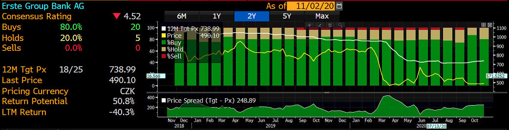 Výsledky za Q4 negativně ovlivní částečné uzavření ekonomiky, které rakouská vláda vyhlásila v sobotu kvůli rychlému nárůstu počtu nakažených koronavirem. Zatím by mělo platit do konce listopadu. Většina analytiků Bloombergu doporučuje Erste bank k nákupu.