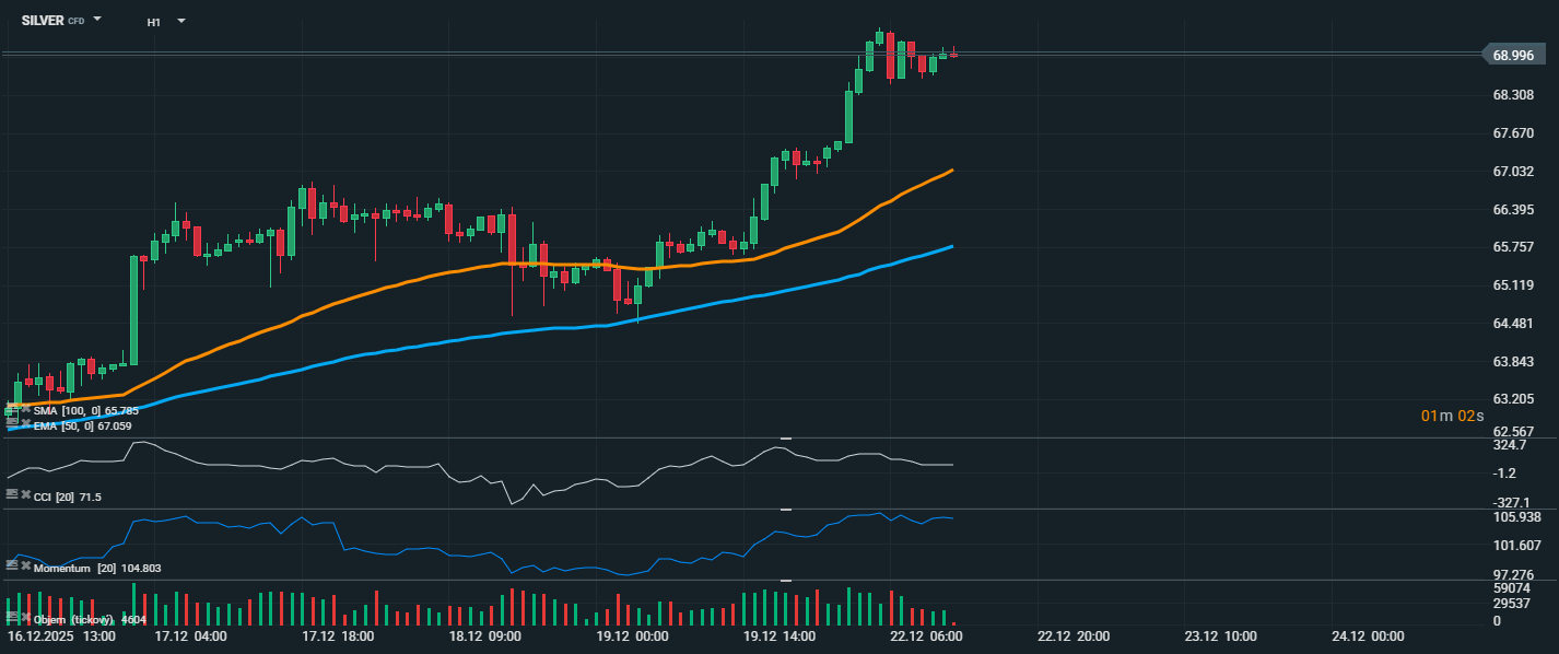 Cena stříbra se vyšplhala na nové historické maximum 68,996 USD, čímž potvrdila pokračující býčí trend. Technické indikátory ukazují silnou podporu kupců – EMA 50 se nachází na úrovni 67,059 USD a SMA 100 na 65,785 USD, což znamená, že cena je výrazně nad oběma klouzavými průměry. To podtrhuje aktuální růstovou sílu trhu. CCI dosahuje hodnoty 71,5, což naznačuje mírné překoupení, ale ne extrémní. Momentum se drží na úrovni 104,8, což potvrzuje dynamický růst bez známek zpomalení. Objem obchodů zůstává stabilní i po průrazu rezistence, což ukazuje na pokračující zájem investorů. Cena stříbra si po prudkém růstu tvoří konsolidační pásmo, které může být odrazovým můstkem k dalšímu růstu, pokud dojde k prolomení hladiny 69 USD směrem vzhůru.