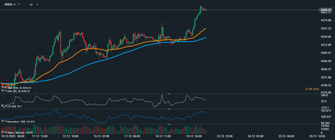 Cena zlata dnes vzrostla o 1,7 % na 4 412,94 USD za unci, čímž překonala říjnové maximum 4 381 USD. Stříbro posílilo o 2,6 % na 68,88 USD, přičemž během dne se přiblížilo k hranici 70 USD za unci. Tyto pohyby byly podpořeny slabším dolarem a nízkou likviditou konce roku, která zvyšuje volatilitu.
