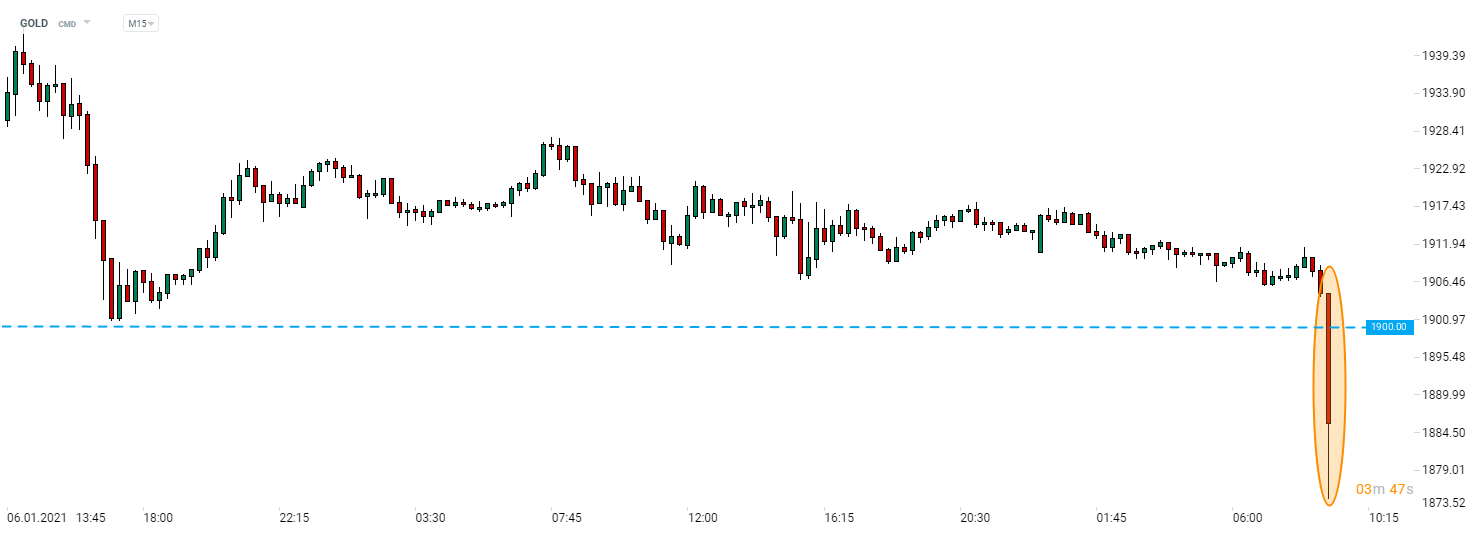 Zlato zaznamenalo na začiatku európskeho obchodovania pokles, keď sa medveďom podarilo prekonať hranicu 1 900 dolárov. Zdroj: xStation5