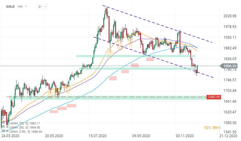 Zlato bylo v poslední době pod tlakem. Do kolen ho srazila nízká riziková averze na trzích, která přišla s úspěšným vývojem vakcín proti koronaviru a s pozitivní situací po amerických prezidentských volbách. Dnes jsme však svědky prudké korekce. Zlato se odrazilo od spodní limity klesajícího kanálu a dostalo se zpět nad úroveň 1 800 dolarů za unci. Další drahé kovy jako stříbro, paládium nebo platina také zaznamenávají solidní zisky. Hlavním důvodem pozitivní korekce je pokles amerického dolaru. Pár EURUSD se už přiblížil na dohled úrovni 1,20.