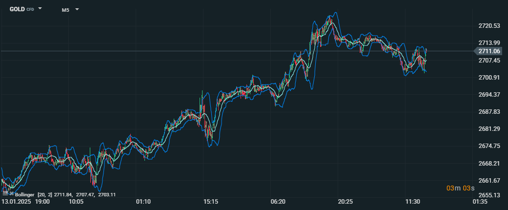 Vývoj ceny zlata (GOLD CFD) na 5minutovém grafu s indikátorem Bollingerova pásma (perioda 20). Cena zlata dosáhla úrovně 2 713,99 USD za trojskou unci, ale následně klesla na 2 707,45 USD. Bollingerova pásma naznačují zvýšenou volatilitu, přičemž cena osciluje kolem střední hodnoty pásma. Zdroj: xStation5