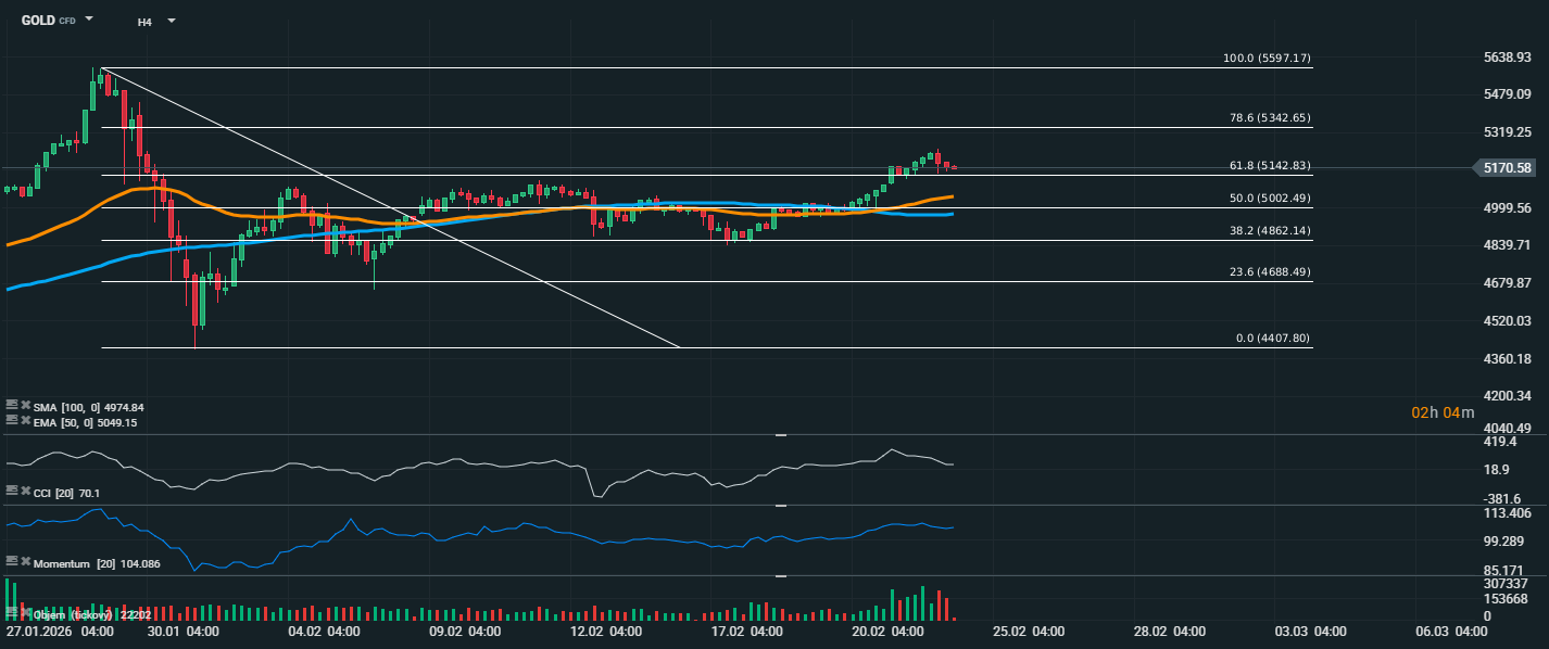 Cena zlata se odrazila od předchozí korekce a aktuálně se obchoduje kolem 5 170 USD, tedy v blízkosti Fibonacciho hladiny 61,8 % (5 142,83 USD). Po předchozím poklesu do oblasti 4 400 USD trh postupně vytvořil stabilní růstovou strukturu vyšších minim i maxim. Cena se nyní drží nad klouzavými průměry, konkrétně nad EMA 50 (5 049 USD) i nad SMA 100 (4 974 USD), což potvrzuje krátkodobé býčí nastavení. EMA 50 navíc začíná opět mírně stoupat, což signalizuje sílící momentum. Z pohledu Fibonacciho analýzy je nejbližší rezistence na úrovni 78,6 % (5 342 USD). Její proražení by otevřelo prostor směrem k předchozímu maximu na 5 597 USD (100 %). Naopak nejbližší podpora se nachází na 50 % (5 002 USD) a níže pak na 38,2 % (4 862 USD). CCI se pohybuje kolem hodnoty 70, což naznačuje zvýšený nákupní tlak, avšak zatím bez extrémní překoupenosti. Momentum se drží nad neutrální úrovní 100 bodů, což podporuje pokračování růstového scénáře. Celkově zlato zůstává v krátkodobém růstovém trendu, přičemž klíčové bude sledovat reakci trhu na pásmo 5 200–5 340 USD.