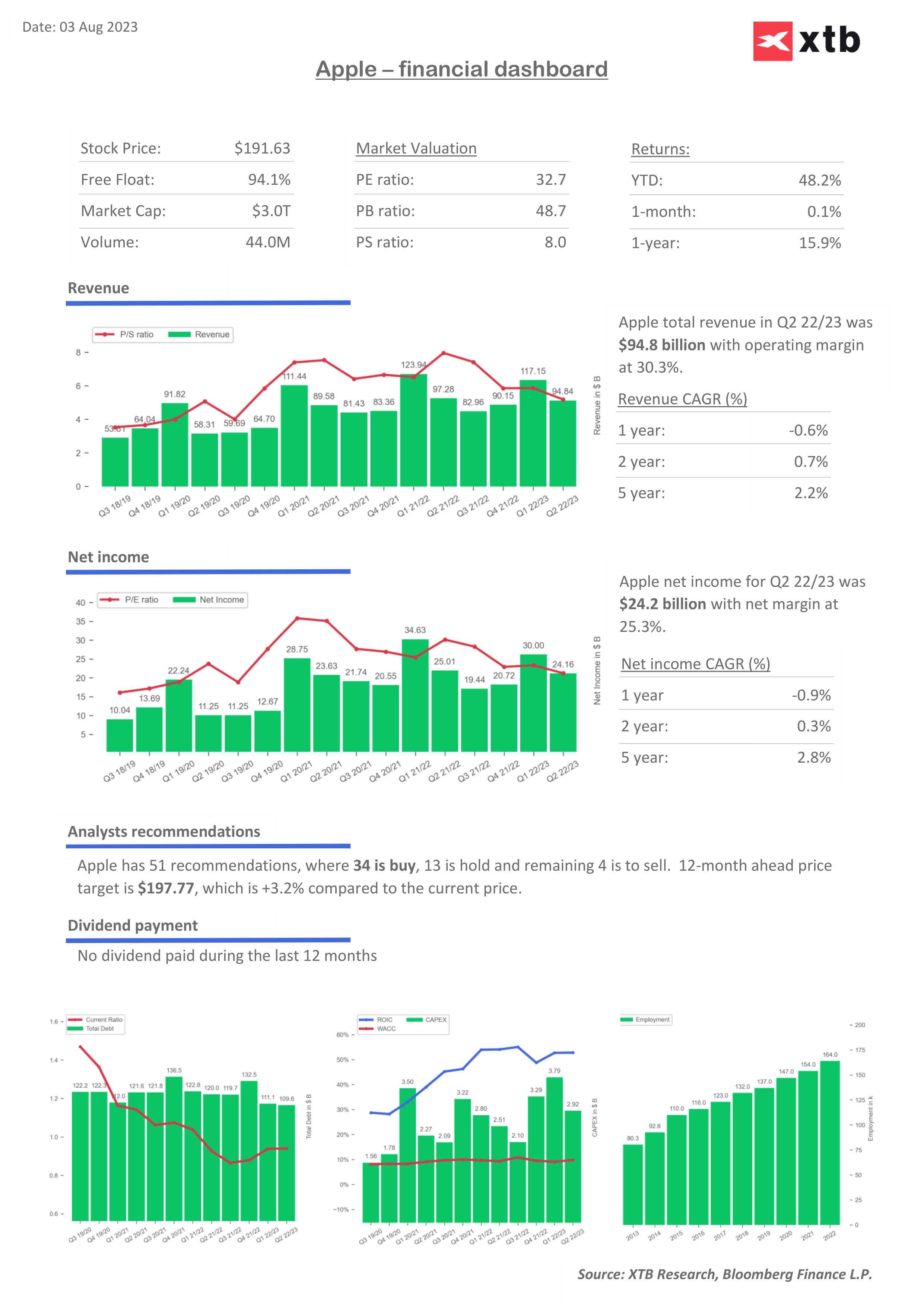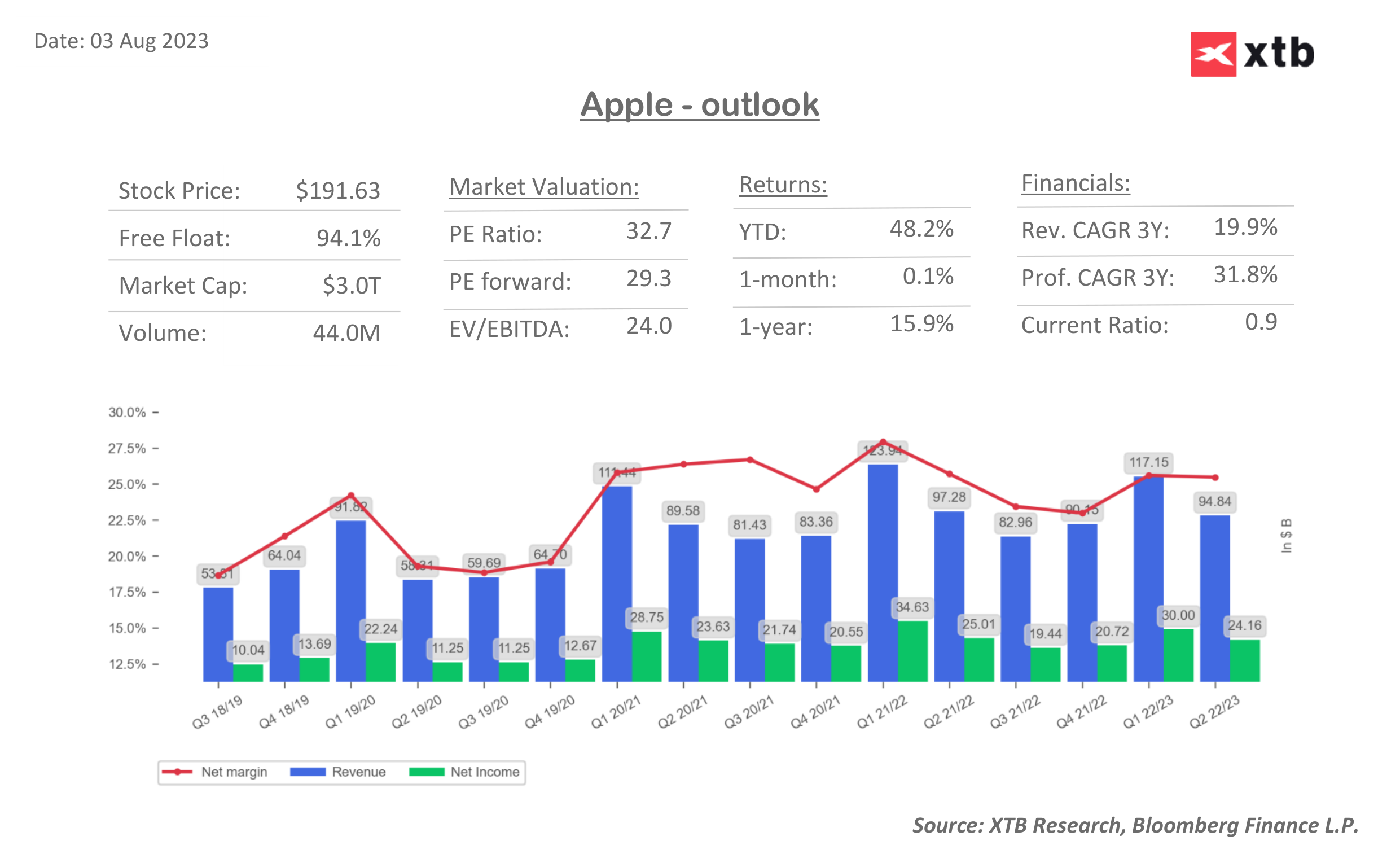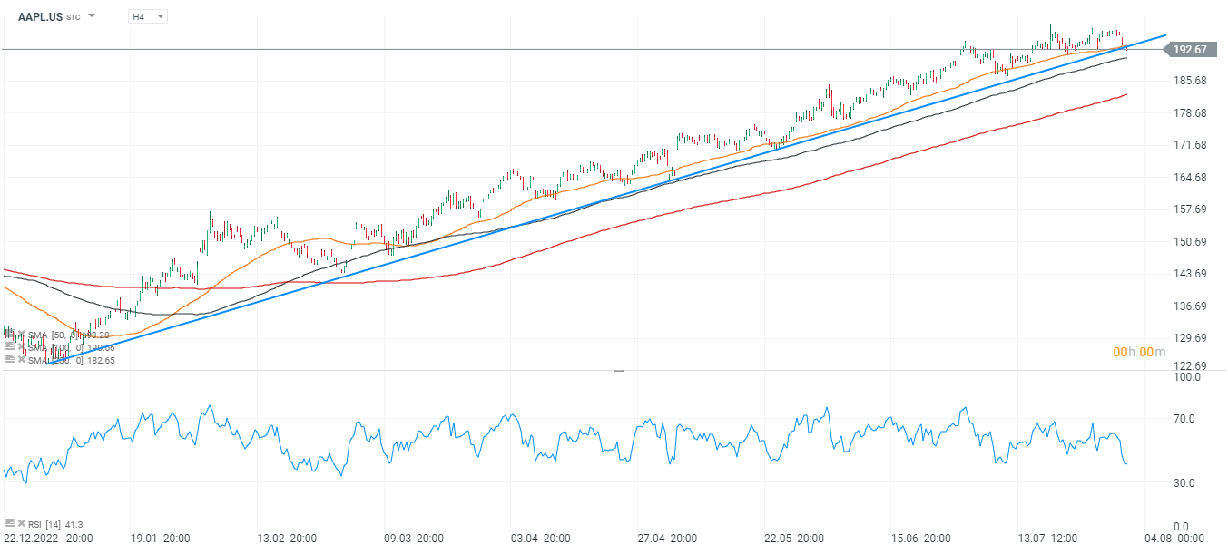 Druhé čtvrtletí je pro společnost Apple sezónně nejslabší. Hlavní hrozbou pro sentiment jsou opatrné prognózy a nižší prodeje vlajkových lodí iPhone. V poslední době hlásí technologické agentury i slabší obchody související s chytrými telefony. Nepřímo ji ovlivňují vyšší úrokové sazby. Společnost neposkytuje podrobné prognózy od roku 2020, přes které se trh bude muset spolehnout na komentáře k prodejům a obecný narativ kolem zprávy. Vzhledem k velikosti a globálnímu dosahu produktů společnosti Apple trhy také čekají, zda bude společnost v dalších čtvrtletích očekávat vyšší poptávku. Takový scénář by zvýšil pravděpodobnost pozitivního "měkkého přistání" ekonomik.