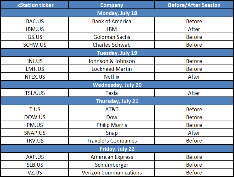 Výsledková sezóna za druhý kvartál je na Wall Street v plném proudu. Velké americké banky započaly velký maraton na konci minulého týdne. Tento týden bude však pestřejší. Investoři dnes dostanou report 2 velkých amerických bank (Bank of America a Goldman Sachs). Pozornost bude však věnována především středečnímu reportu společnosti Tesla. Po uzavření americké seance se dozvíme výsledky společnosti IBM, kterou bude zítra následovat Netflix. Uprostřed nestabilní politické situace budou bedlivě sledovány výsledky hospodaření Lockheed Martin, jedné z největších amerických společností ze sektoru obrany. V tomto týdnu bude vykazovat celkem 7 firem indexu Dow Jones. Jedná se o American Express, Goldman Sachs, Dow, IBM, Johnson & Johnson, Travelers a Verizon Communications.