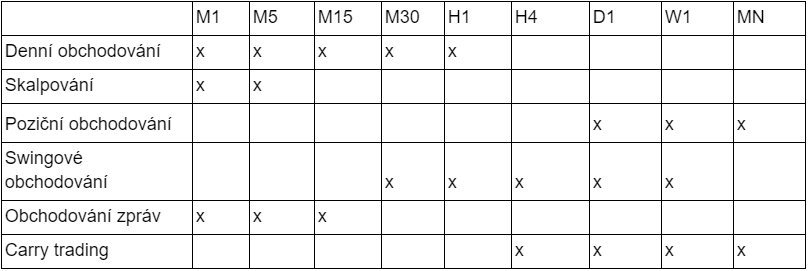 Většina obchodníků na devizovém trhu využívá technickou analýzu k detekci cenových trendů. Následující příklady časových rámců, které obvykle používají různé typy obchodníků, jsou zobrazeny v tabulce: