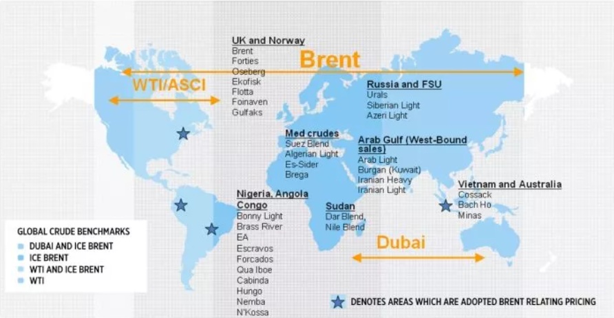 Nejdůležitější světové ropné benchmarky. Zdroj: Intercontinental Exchange (ICE)