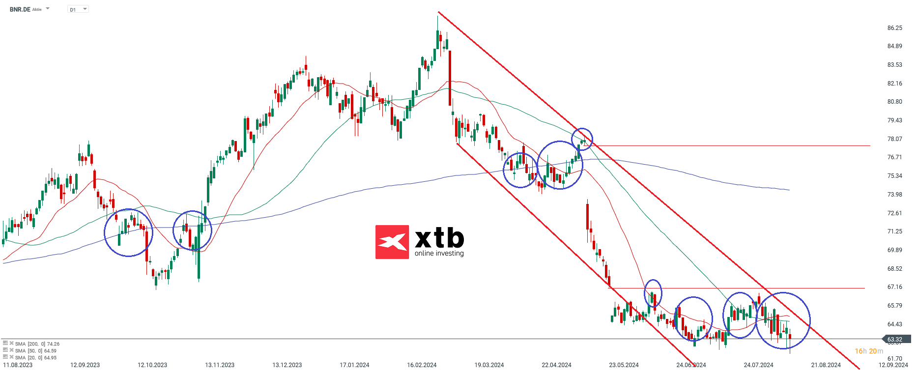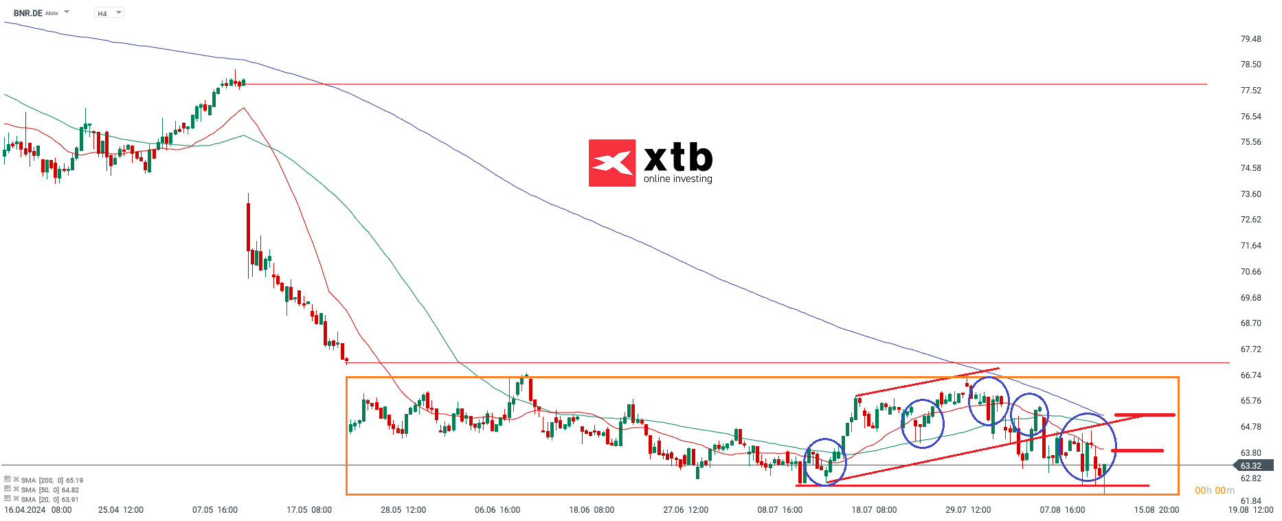 Im 4h Chart ist erkennbar, dass die Aktie sich seit Ende Mai in einer stabilen Seitwärtsbox bewegt. Mitte Juli haben sich zwar moderate Erholungen eingestellt, diese wurden aber nachfolgend im August wieder abverkauft. In den letzten Handelswochen ist die Aktie zwischen der SMA20 (aktuell bei 63,91 EUR) und der SMA50 (aktuell bei 64,82 EUR) hin und her gependelt. Die SMA200 (aktuell bei 65,19 EUR) wurde im Zuge der Erholungsbewegung im Juli nicht ganz erreicht. Das Papier drehte bereits vorher wieder in Richtung Süden. Seit einigen Handelstagen notiert die Aktie unter der SMA20 und hat sich auch darunter etabliert.