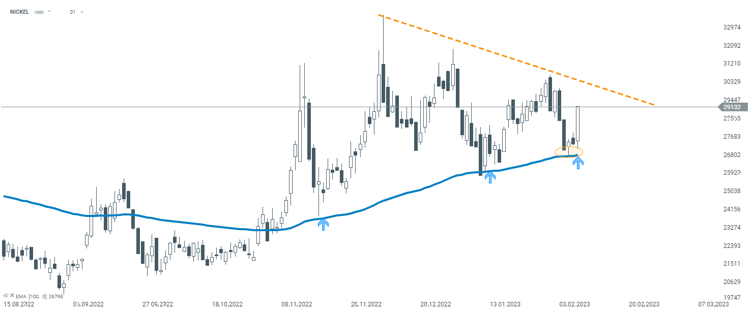 Die Nickelnotierungen sind in den letzten Tagen von der Unterstützung durch den durchschnittlichen EMA 100 abgeprallt und bewegen sich auf die Linie zu, die nach den jüngsten Höchstständen gezogen wurde. Quelle: xStation5 von XTB