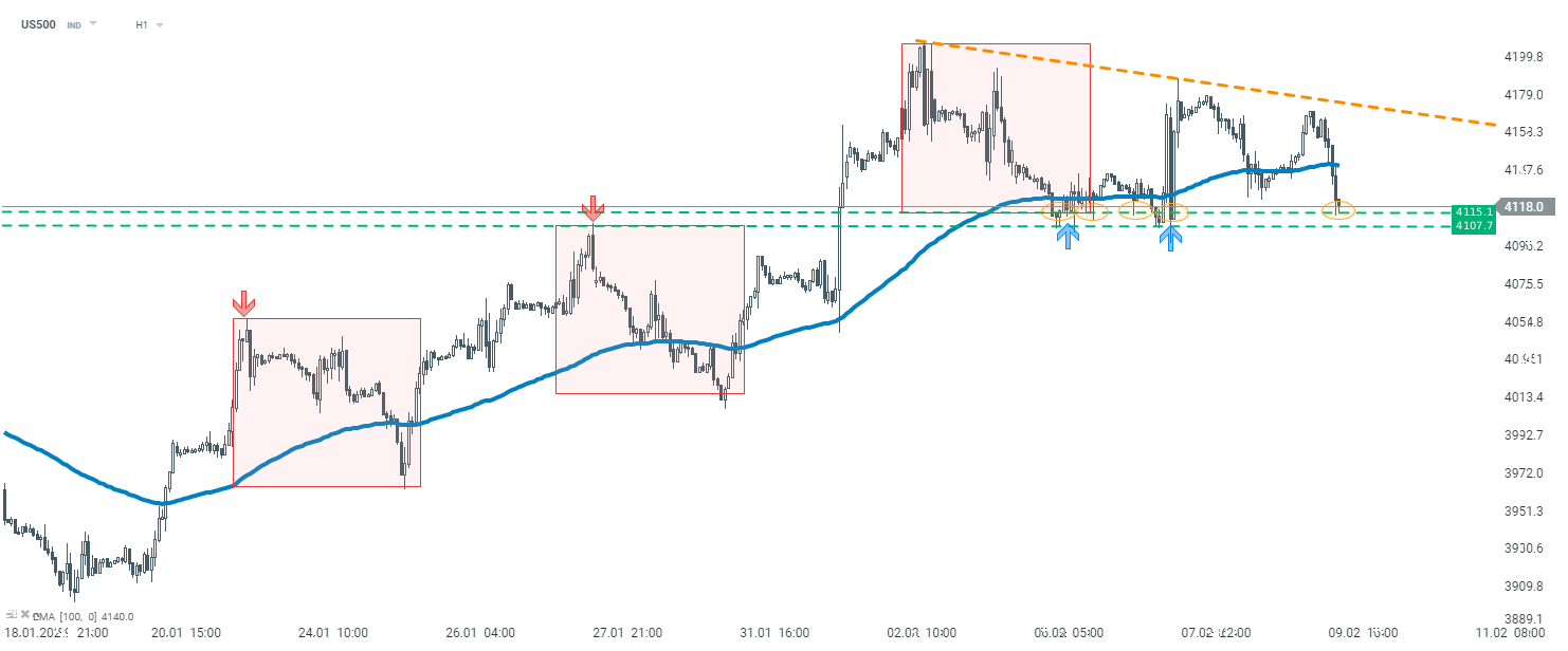 Dem S&P 500 / US500 ist es nicht gelungen, über die von den jüngsten Höchstständen gezogene Linie zu steigen. Wir sehen derzeit einen Rückschlag und einen erneuten Test der wichtigen kurzfristigen Unterstützungszone bei 4107-4115 Punkten. Quelle: xStation5 von XTB
