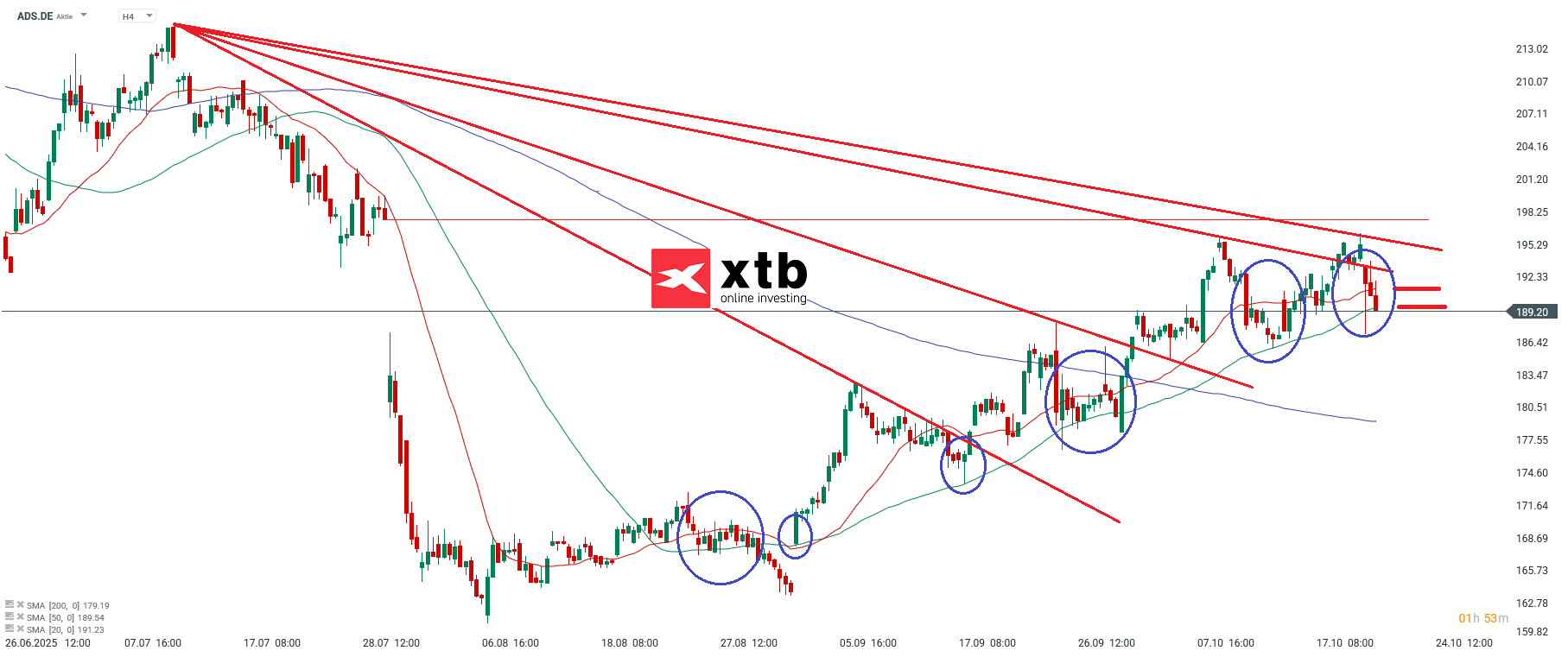 Der gestrige Rücksetzer testete die SMA20 (188,13 €), wobei der Schlusskurs knapp darüber lag – ein potenziell entscheidendes Signal für die weitere adidas Prognose.