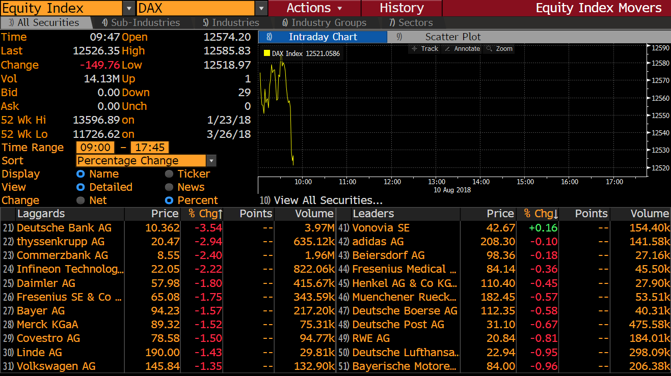 Die Blue-Chip-Indizes aus Europa eröffneten am letzten Handelstag der Woche deutlich tiefer. Banken schnitten aufgrund von Bedenken, ob sich die türkische Krise auf die europäischen Kreditgeber auswirkt, unterdurchschnittlich ab. Die stärksten Rückgänge waren an den italienischen, spanischen und russischen Aktienmärkten zu beobachten. Kein einziger europäischer Large-Cap-Index eröffnete mit einem bullischen Gap. Alle 19 Sektor-Subindizes des STOXX Europe 600 notieren in den ersten Handelsminuten der europäischen Sitzung tiefer. Banken und Bergbauunternehmen verzeichnen hierbei die größten Rückgänge.