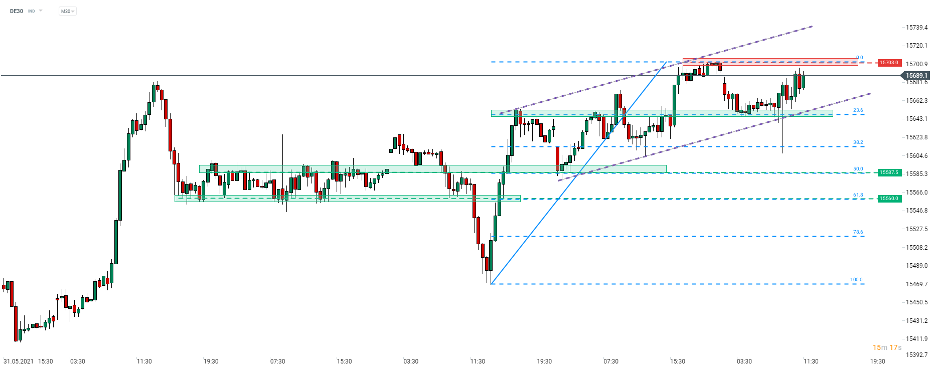 Der deutsche DE30 handelt weiterhin innerhalb eines kurzfristigen Aufwärtskanals. Der Rückgang vor dem heutigen Cash-Session-Start drückte den Index unter das 23,6%-Retracement des jüngsten Aufwärtsimpulses und unter die untere Begrenzung des Kanals, aber die Bullen konnten die Verluste wieder aufholen. Der Index scheint sich auf einen Test der Widerstandszone bei ca. 15.700 Punkten vorzubereiten, die mit den Allzeithochs markiert ist. Sollten wir einen Durchbruch zu neuen Rekorden sehen, könnte sich die obere Grenze des oben erwähnten Kanals bei ca. 15.740-15.750 Pkt. als kurzfristiges Hindernis für Käufer erweisen. Sollten wir andererseits einen Pullback sehen, sollten sich Investoren auf die Fibonacci-Retracements als potentielle Unterstützungen konzentrieren - 23,6% Retracement bei 15.650 Pkt. und 38,2% Retracement bei 15.615 Pkt.