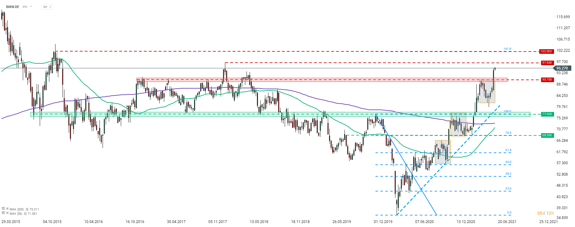 BMW (BMW.DE) setzt zu Beginn der neuen Woche eine steile Aufwärtsbewegung fort. Die Aktien des deutschen Automobilherstellers sprangen von den Tiefstständen im März 2020 um mehr als 150% nach oben und handeln auf dem höchsten Stand seit Anfang 2018. Die nächste zu beobachtende Widerstandszone ist mit den 2018er-Hochs bei 97,50 € markiert, während der nächste größere Widerstand beim 161,8%-Äußeren Retracement des 2020er-Rückgangs (102,00 €) zu finden ist. Quelle: xStation5
