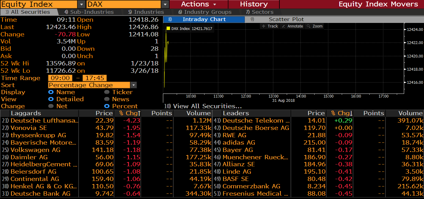 Die europäischen Aktienmärkte weisen am Freitag weitgehend Kursrückgänge auf. Dies ist auf eine weitere Eskalation beim Handelskonflikt zwischen den USA und China zurückzuführen sowie Trumps Androhung die Welthandelsorganisation (WTO) zu verlassen. Nach 30 Minuten fällt der DE30 um fast 0,9% und ist damit der schwächste Aktienindex in Europa. Während sich die allgemeine Stimmung am Aktienmarkt deutlich verschlechtert hat, leiden die Schwellenländerwährungen weiterhin unter ihren starken Rückgängen vom Donnerstag. Insbesondere die Abwertung des argentinischen Peso sorgte für Aufmerksamkeit. Dies veranlasste die Zentralbank dazu, den 7-Tage-Reposatz um bis zu 1.500 Basispunkte auf 60% anzuheben.