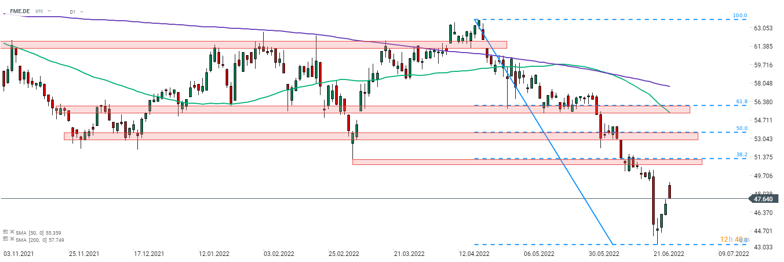 Fresenius Medical Care (FME.DE) startete den heutigen Handel mit einer großen zinsbullischen Kurslücke nach einer doppelten Heraufstufung von „Verkaufen“ auf „Kaufen“ bei Jefferies. Die Aktie startete um über 3 % höher in den Handel, aber dieser Gewinn wurde bereits auf etwa 2,2 % reduziert, da die Bullen darum kämpfen, die Erholungsbewegung aufrechtzuerhalten. Quelle: xStation5