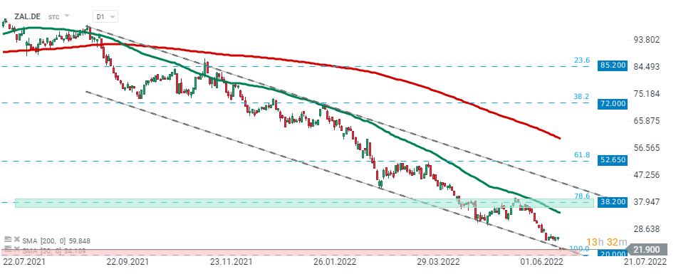 Zalando (ZAL.DE) die Aktie stürzte auf ein mehr als dreijahres Tief und machte alle Pandemiegewinne zunichte. Die Aktie startete in die heutige Sitzung mit einer rückläufigen Preislücke und wird derzeit unter der Untergrenze des absteigenden Kanals gehandelt. Wenn sich die aktuelle Stimmung durchsetzt, könnte eine große psychologische Unterstützung bei 20,00 € gefährdet sein, wo sich die Tiefststände von 2018 befinden. Quelle: xStation5