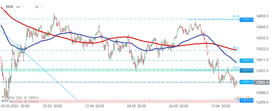 DE30 fiel erneut unter die Marke von 13.000 Punkten nach der Veröffentlichung enttäuschender ifo-Geschäftsklimadaten. Solange der Preis darunter liegt, könnte ein weiterer Abwärtsimpuls in Richtung Tiefststände ab März 2022 ausgelöst werden. Wenn es den Käufern andererseits gelingt, die Kontrolle zurückzugewinnen, liegt der nächste zu beobachtende Widerstand bei 13325 Punkten und ist mit einem 23,6%-Retracement der Anfang Januar 2022 begonnenen Abwärtsbewegung markiert. Quelle: xStation5