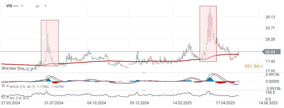 Der CBOE Volatility Index (VIX) steigt heute um fast 9 %, da die Anleger mit Angst auf Donald Trumps Warnung reagieren. Der ehemalige Präsident deutete zunächst an, dass er einen Zoll von 25 % auf Apple (AAPL.US, Aktien im vorbörslichen Handel um fast 4 % gefallen) erheben könnte, ein privates Unternehmen. Anschließend kündigte er an, dass die USA ab dem 1. Juni 2025 Zölle in Höhe von 50 % auf Europa erheben werden, aufgrund von seiner Meinung nach unfairen Beschränkungen für amerikanische Produkte.
