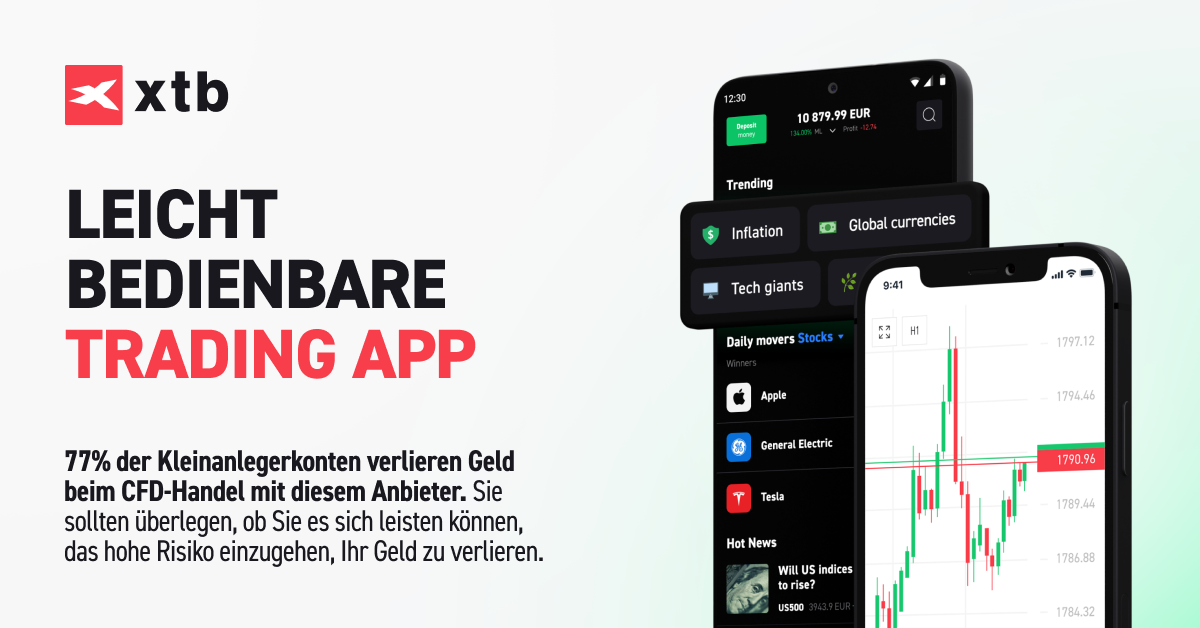 CFD sind komplexe Instrumente und beinhalten wegen der Hebelwirkung ein hohes Risiko, schnell Geld zu verlieren. 71% der Kleinanlegerkonten verlieren Geld beim CFD-Handel mit diesem Anbieter. Sie sollten überlegen, ob Sie verstehen, wie CFDs funktionieren und ob Sie es sich leisten können, das hohe Risiko einzugehen, Ihr Geld zu verlieren. Anlageerfolge sowie Gewinne aus der Vergangenheit garantieren keine Erfolge in der Zukunft. Inhalte, Newsletter und Mitteilungen von XTB stellen keine Anlageberatung dar. Die Mitteilungen sind als Werbemitteilung zu verstehen.