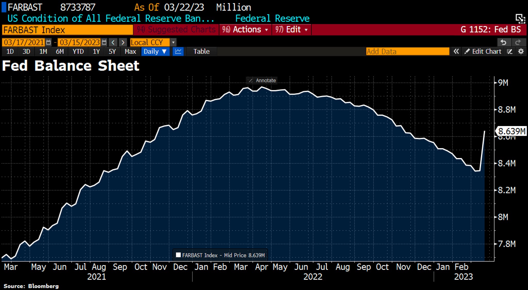 Die Aufmerksamkeit der Anleger konzentriert sich auf die Bilanz der Fed, die weiter wächst. Das Gesamtvermögen stieg um 94,5 Milliarden US-Dollar auf 8,734 Billionen US-Dollar. Die Kreditaufnahme im Rahmen des Diskontfensters fiel von 152,8 Milliarden US-Dollar auf 110,2 Milliarden US-Dollar, und die Mittel für das neue „Bank Term Funding Program“ stiegen von 11,9 Milliarden US-Dollar auf 53,7 Milliarden US-Dollar. Die Kreditvergabe an Banken im Rahmen der FDIC stieg von 142,8 Milliarden US-Dollar auf 179,8 Milliarden US-Dollar. Gleichzeitig ist anzumerken, dass die Fed begonnen hat, Repogeschäfte mit ausländischen Banken zu tätigen. Kurzfristig positive Daten für den Markt durch mehr Überschussliquidität im Sektor.