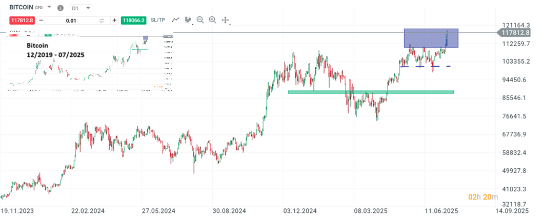 Der größte US-Index, der US500, befindet sich derzeit im Bereich seiner historischen Höchststände, nachdem er seit Anfang April einen Anstieg von mehr als 25 % verzeichnet hat. Diese Woche könnte in mehrfacher Hinsicht entscheidend sein. Zunächst beginnt am Dienstag die Quartalsberichtssaison mit den größten Banken, darunter JP Morgan, Citigroup, Wells Fargo und BlackRock. Am Mittwoch wird dann der Verbraucherpreisindex für Juni veröffentlicht, und im Hintergrund stehen die Handelsverhandlungen und Zölle. All diese Faktoren könnten in Verbindung mit den hohen Unternehmensbewertungen dazu führen, dass die Anleger besonders empfindlich auf Überraschungen reagieren. Aus diesem Grund empfehlen wir, die größten US-Indizes, darunter den Leitindex US500, im Auge zu behalten.