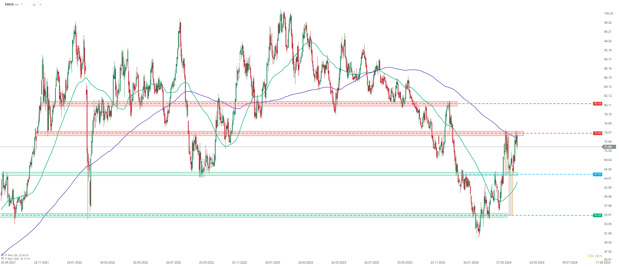 Ein Blick auf das EMISS-Chart im D1-Intervall zeigt, dass sich die Preise in den letzten ein bis zwei Wochen erholt haben und von etwa 65 € auf über 74 € pro Tonne gestiegen sind. Den Bullen gelang jedoch kein nachhaltiger Ausbruch über die Widerstandszone von 74 €, die durch vorherige Preisreaktionen, das vorherige lokale Hoch und den gleitenden 200-Sitzungs-Durchschnitt (violette Linie) markiert ist, und der Rohstoff begann zu sinken. Infolgedessen bildete sich im Bereich von 74 € ein Doppeltop heraus. Die Nackenlinie des Musters befindet sich im Bereich von 65 €, und ein Durchbruch darunter könnte den Weg für einen tieferen Rückgang ebnen. Die Lehrbuchspanne für den Ausbruch nach unten unter die Nackenlinie deutet auf die Möglichkeit eines Rückgangs auf bis zu 56 € pro Tonne hin, was dem niedrigsten Stand seit Mitte März 2024 entsprechen würde.
