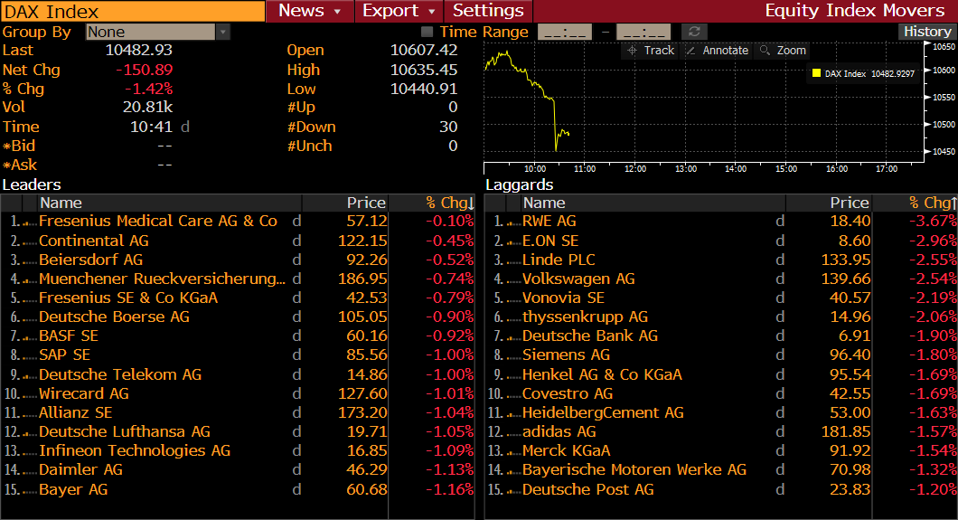 Alle DE30-Mitglieder notieren am Donnerstagmorgen niedriger. Quelle: Bloomberg