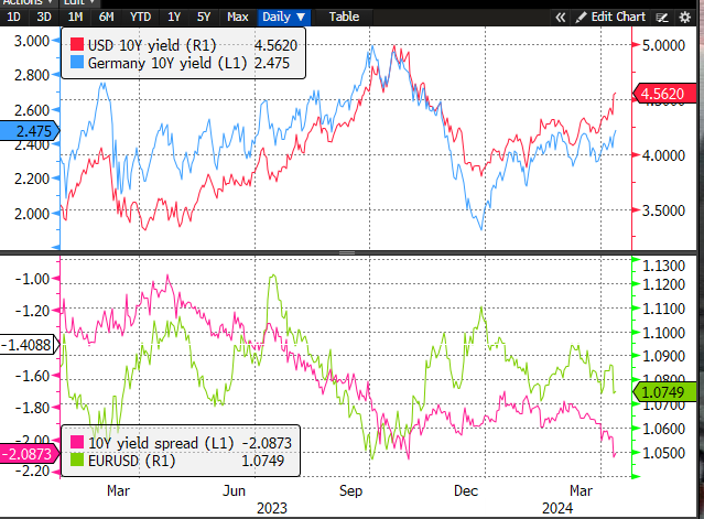 Erwartet wird ein Anstieg von nur 0,3 % gegenüber dem Vormonat, obwohl die Ölpreise in letzter Zeit stark angestiegen sind. Außerdem haben wir in letzter Zeit einen sehr starken Anstieg der Renditen in den USA und einen begrenzten Anstieg in Deutschland erlebt. Die Divergenz zwischen den Renditen deutet darauf hin, dass das EURUSD-Paar immer noch zu hoch bewertet sein könnte. Andererseits dürfte ein möglicher Boden um die Jahresmitte herum erreicht werden.