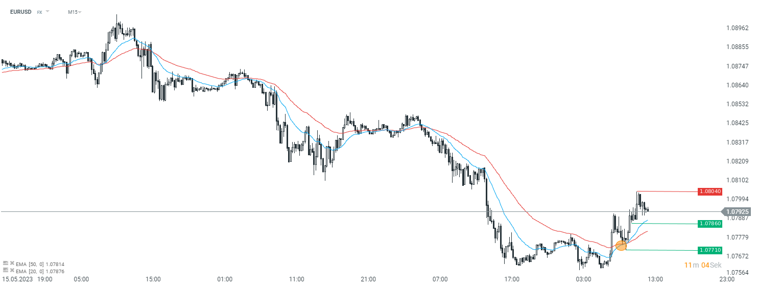 Die höheren Hochs über den gleitenden Durchschnitten und das Crossover (EMA20 kreuzt EMA50 von unten) signalisieren einen Aufwärtstrend. Eine Trendbestätigung würde mit einem Bruch über das heutige Tageshoch bei 1,0804 einhergehen.