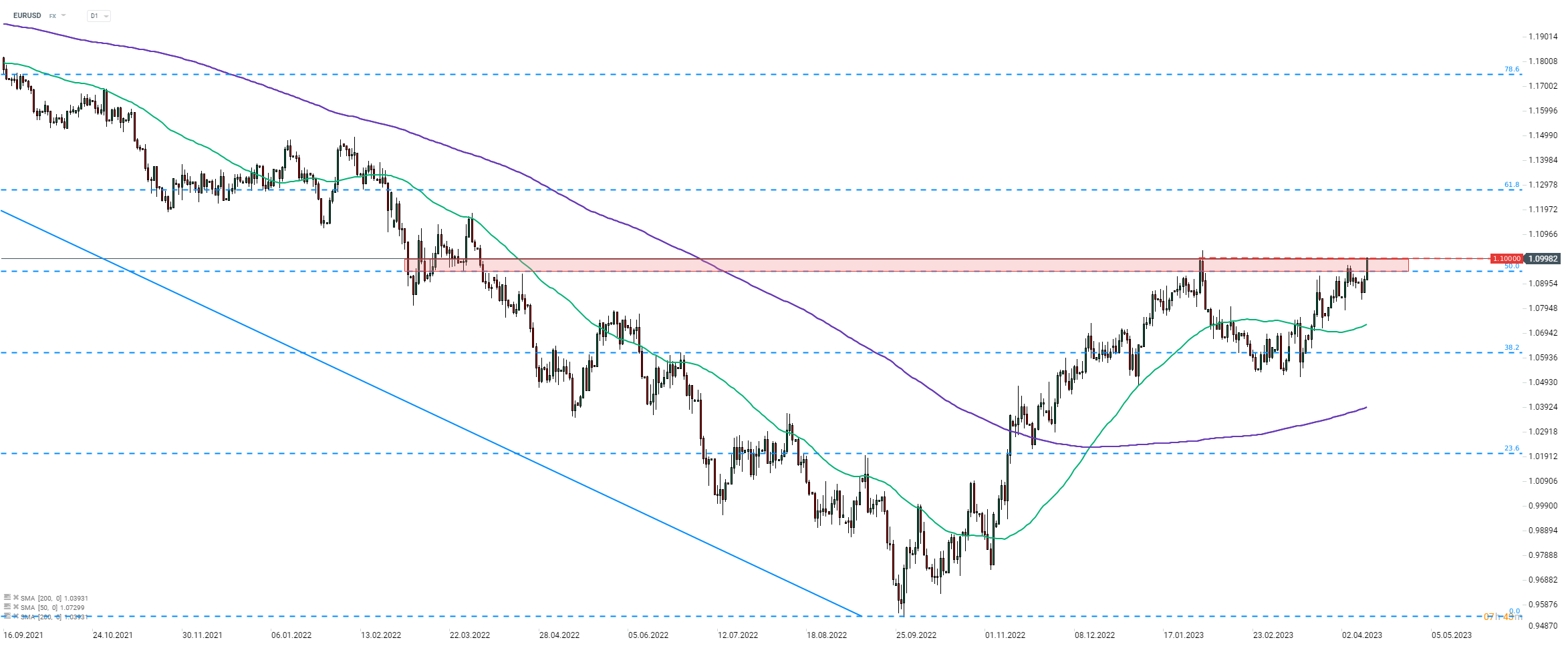 Ein Blick auf das EURUSD-Diagramm im D1-Intervall zeigt, dass das Paar versucht, über die Widerstandszone zu brechen, die zwischen dem 50%-Retracement des Anfang 2021 eingeleiteten Abwärtsimpulses und der Marke von 1,10 liegt. Beachten Sie, dass diese Zone den vorherigen Aufwärtsimpuls Anfang Februar gestoppt hat.