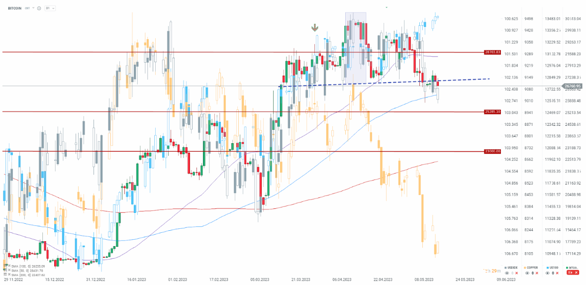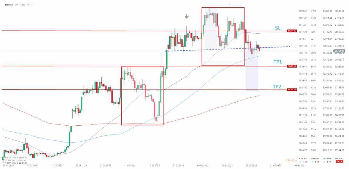 Bitcoin hat die Nackenlinie der Schulter-Kopf-Schulter-Formation (SKS) durchbrochen, was ein Zeichen für eine mögliche Trendumkehr sein könnte. Zusätzlich korreliert Bitcoin stark mit dem Dollar, der in letzter Zeit an Stärke gewonnen hat. Kupfer, das als riskanter Vermögenswert gilt, verliert ebenfalls an Wert, was keine guten Aussichten für andere riskante Vermögenswerte wie Bitcoin darstellt. Auf der anderen Seite bleibt der Nasdaq widerstandsfähig, was verwirrend sein kann. Das große Risiko für diese Handelsidee besteht in einem möglichen Bankrott der Vereinigten Staaten, was zu einem erhöhten Interesse an Vermögenswerten führen könnte, die nicht an die US-Regierung gebunden sind. Andererseits könnte der Zusammenbruch der Vereinigten Staaten zu Marktpanik führen, ähnlich wie zu Beginn der Pandemie. In diesem Fall würden Investoren um jeden Preis Liquidität suchen und alle Vermögenswerte abstoßen. Wir erwarten eine mögliche Testphase im Bereich von 25.300 Dollar, wo wir wichtige Unterstützung und den Bereich der größten Korrektur im Aufwärtstrend dieses Jahres sehen können.
