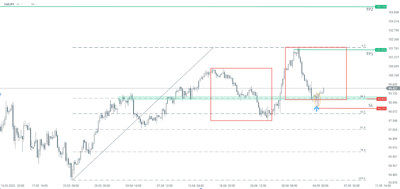 Das Währungspaar CADJPY hat in letzter Zeit eine lokale Abwärtskorrektur erfahren. Betrachtet man den H4-Chart, so kann man erkennen, dass es den Käufern gelungen ist, die Abwärtsbewegung an der kurzfristigen Schlüsselunterstützung zu stoppen. Der grüne Bereich bei 98,80 markiert die untere Grenze der 1:1-Struktur. Darüber hinaus ist eine Hammer-Kerzenformation auf dem Chart zu sehen. In Anbetracht dessen scheint eine Fortsetzung der Aufwärtsbewegung das Basisszenario zu sein. Potenzielle Ziele liegen bei 101,65 und 104,15.