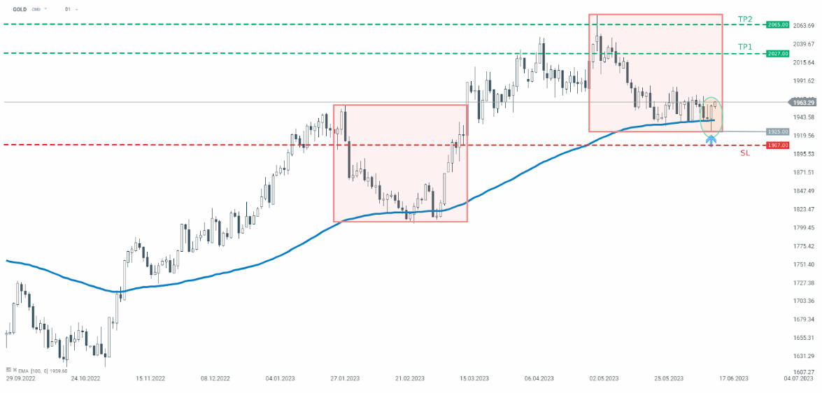 Der Goldmarkt hat sich in letzter Zeit in einem Aufwärtstrend befunden. Wenn man den D1-Chart betrachtet, kann man sehen, dass die jüngste Abwärtskorrektur die wichtige technische Unterstützung erreicht hat, wo die Rückgänge gestoppt wurden. Die Unterstützung bei 1.925 US-Dollar auf dem unten stehenden Chart ist das Ergebnis des EMA100 und der unteren Grenze der 1:1-Struktur. Gemäß der Overbalance-Strategie sieht es solange der Preis über der genannten Unterstützung liegt, nach einem Aufwärtstrend aus. Zusätzlich erscheint auf dem Chart ein bullisches Kerzenmuster - eine Hammer-Formation, die das Szenario unterstützt. Potenzielle Ziele liegen bei 2.027 und 2.065 US-Dollar.