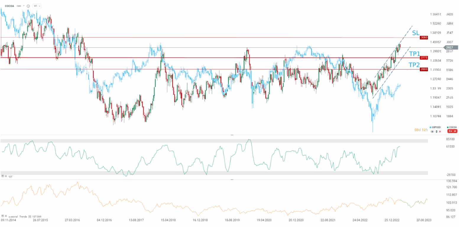 Der Kakaopreis ist so hoch wie seit 2016 nicht mehr, was auf die Sorgen um das Wetter und das künftige Angebot zurückzuführen ist. Die Saison 2022/2023 hat aufgrund eines Produktionsrückgangs ein erhebliches Defizit auf dem Kakaomarkt gezeigt. Für die Saison 2023/2024 wird jedoch mit einem ordentlichen Produktionsanstieg gerechnet. Dies hängt mit der Abholzung der Wälder in Côte d'Ivoire und einer besseren Einhaltung des Mindestabnahmepreises zusammen, was die Landwirte dazu ermutigen dürfte, mehr anzubauen. Natürlich gibt es in diesem Jahr einige Bedenken hinsichtlich des Wetters und der anhaltenden Probleme mit der Düngemittelknappheit, aber der derzeitige hohe Kakaopreis könnte die Nachfrage senken. Die Schokoladenhersteller könnten die Nachfrage aufgrund hoher Lagerbestände verringern, insbesondere in den USA und Europa, wo die Lagerbestände nicht nur den Fünfjahresdurchschnitt übersteigen, sondern zu Beginn der Zwischensaison auch den höchsten Stand seit fünf Jahren aufweisen. Die mit der Zwischensaison des Kakaomarktes verbundene Saisonalität deutet auf einen möglichen Preisrückgang bis Juli hin. Potenzielle Ziele sind im Chart markiert.
