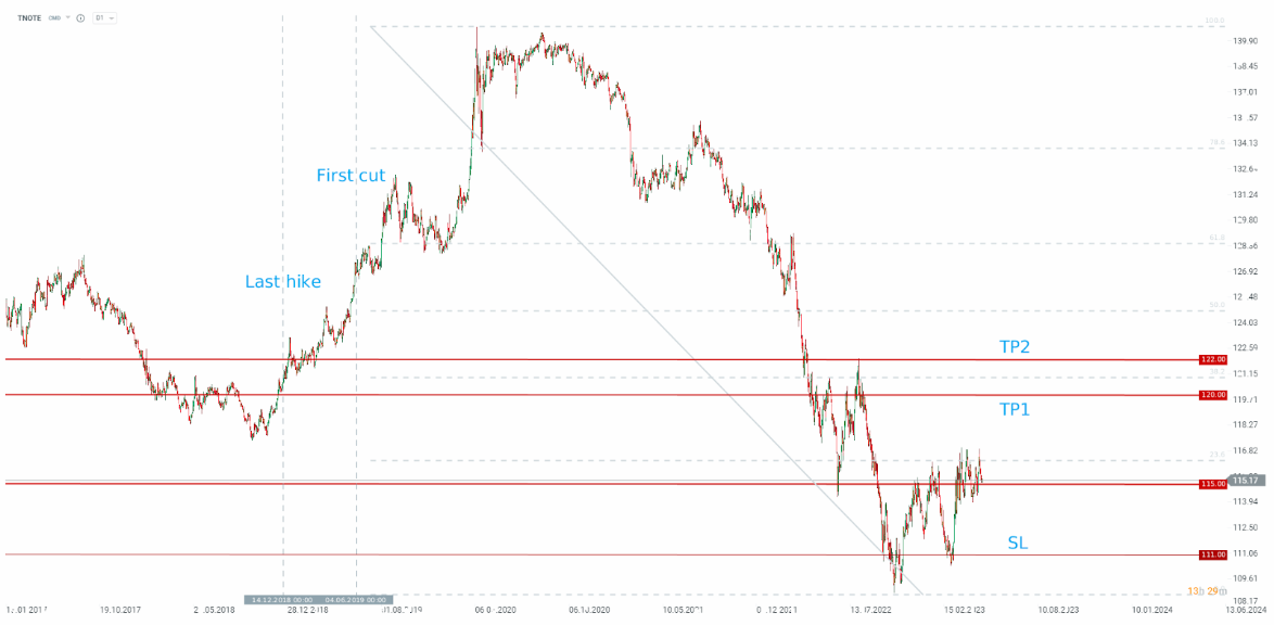 Die Fed hat ihren Zinserhöhungszyklus höchstwahrscheinlich abgeschlossen, obwohl der Markt bei einem möglichen Inflationsanstieg Druck für eine weitere Zinserhöhung ausüben könnte. Dennoch scheint es, dass wir uns bereits am Ende des Zinserhöhungszyklus befinden. 2018, als die Fed den vorherigen Zinserhöhungszyklus beendete, begannen die Anleihepreise deutlich zu steigen und beschleunigten sich, als sechs Monate nach der letzten Zinserhöhung der erste Zinssatzschnitt erfolgte. Die Fed deutet keine Zinssenkungen in diesem Jahr an, aber bei einer geringeren als erwarteten Inflation kann eine Senkung zum Jahresende nicht ausgeschlossen werden, insbesondere da der Markt eine Anpassung von 100 Basispunkten bis Januar nächsten Jahres erwartet. Schon eine Zinssenkung sollte zu einem deutlichen Rückgang der Renditen (Anstieg der Anleihepreise) führen. Die Fed sieht den Leitzins langfristig bei 2,5%, während die aktuellen Renditen für 10-jährige Anleihen bei 3,5% liegen. Darüber hinaus halten Spekulanten eine extrem hohe Anzahl von Short-Positionen in TNOTE-Futures, was ein konträrer Signal sein könnte. Potenzielle Ziele sind im Chart markiert.