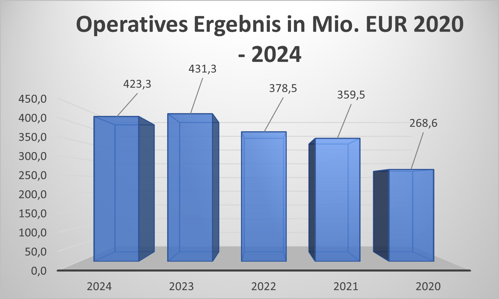 Das operative Ergebnis 2024 liegt nach wie vor über 400 Mio. EUR, ist gegenüber 2023 aber etwas gefallen. Gegenüber 2020 wurden aber 2024 gut 150 Mio. EUR mehr Ergebnis erwirtschaftet.