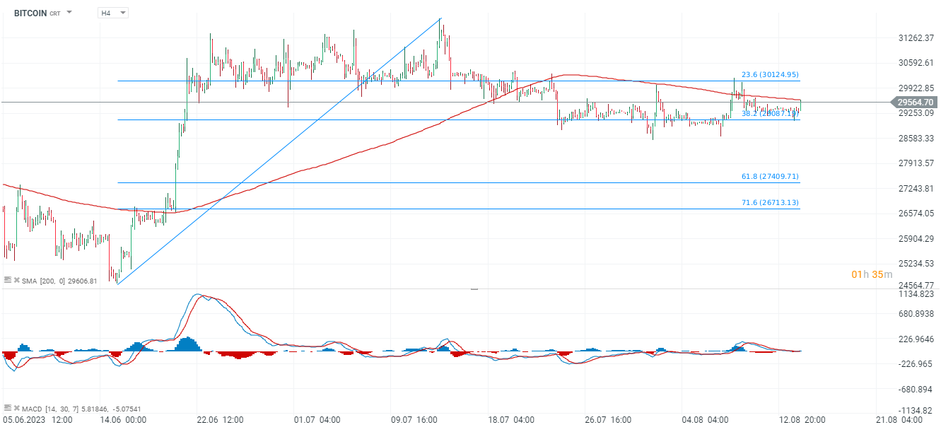 Bitcoin-Chart, H4-Intervall. Der Preis oszilliert zwischen dem 38,2 und 23,6 Fibonacci Retracement der Aufwärtswelle von Mitte Juni. Wenn der SMA200 (rote Linie) und das 23,6 Fibo durchbrochen werden können, könnten wir in dieser Woche einen Versuch sehen, über $30.000 zu steigen.