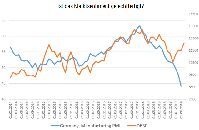 Die Schlüsselfrage ist: Wer hat Recht - die Märkte oder die EMI-Daten? Sicherlich waren auch andere Daten aus der deutschen Wirtschaft alarmierend, aber der EMI ist ein Frühindikator und sollte der erste sein, der eine Richtung setzt. Der ZEW-Bericht zu den Konjunkturerwartungen für April hat nicht zur Lösung des Problems beigetragen. Der Stimmungsindex stieg auf 3,1 Punkte - mehr als erwartet und auf das höchste Niveau eines Jahres. Gleichzeitig sank der Index zur Einschätzung der aktuellen Lage auf 5,5 Punkte - das niedrigste Niveau seit November 2014 und der siebte Rückgang in Folge. Dies zeigt das aktuelle Marktdilemma, denn die Rallye wurde auf Hoffnungen aufgebaut - Hoffnungen bei den Handelsgesprächen zwischen den USA und China, dass die Spannungen abgebaut werden können. Hoffnungen, dass die dovische Fed eine Verlangsamung der US-Wirtschaft verhindern wird. Hoffnungen, dass die chinesischen Konjunkturprogramme zur Erholung des Wachstums beitragen. Dies hat zu einer großen Lücke zwischen Aktienindizes und aktuellen Wirtschaftsdaten geführt, was vor allem in Deutschland deutlich wird. Es scheint offensichtlich zu sein, dass sich die Daten, einschließlich des wichtigsten EMIs zum Fertigungssektor, schnell (und wesentlich) erholen müssen, wenn die Hausse gerechtfertigt sein soll.