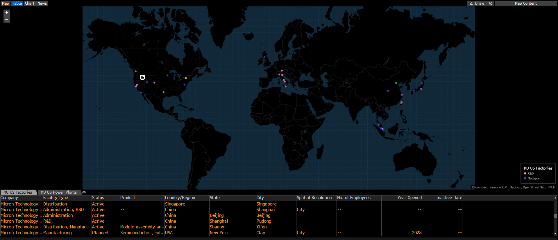 Karte, die alle Forschungs-, Verwaltungs- und Betriebszentren von Micron zeigt. Quelle: Bloomberg