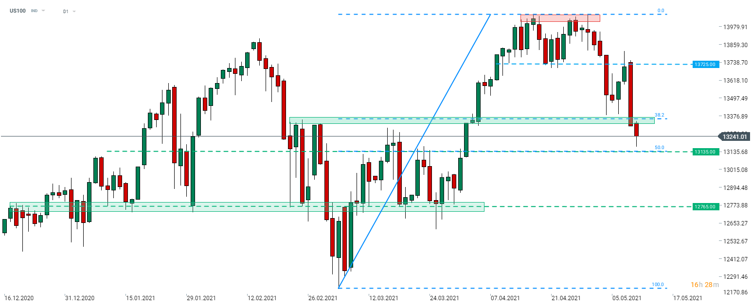 Der US100 stürzte gestern durch den Abverkauf von Tech-Aktien ab. Der Index fiel gestern um über 2,5% und die Abwärtsbewegung wird heute fortgesetzt. US100 brach unter die Unterstützungszone am 38,2% Retracement und handelt auf dem niedrigsten Niveau seit Anfang April. Quelle: xStation5