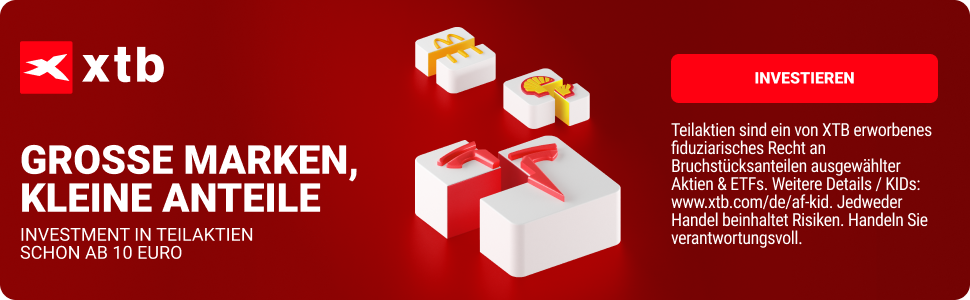 CFD sind komplexe Instrumente und beinhalten wegen der Hebelwirkung ein hohes Risiko, schnell Geld zu verlieren. 71% der Kleinanlegerkonten verlieren Geld beim CFD-Handel mit diesem Anbieter. Sie sollten überlegen, ob Sie verstehen, wie CFDs funktionieren und ob Sie es sich leisten können, das hohe Risiko einzugehen, Ihr Geld zu verlieren. Anlageerfolge sowie Gewinne aus der Vergangenheit garantieren keine Erfolge in der Zukunft. Inhalte, Newsletter und Mitteilungen von XTB stellen keine Anlageberatung dar. Die Mitteilungen sind als Werbemitteilung zu verstehen.