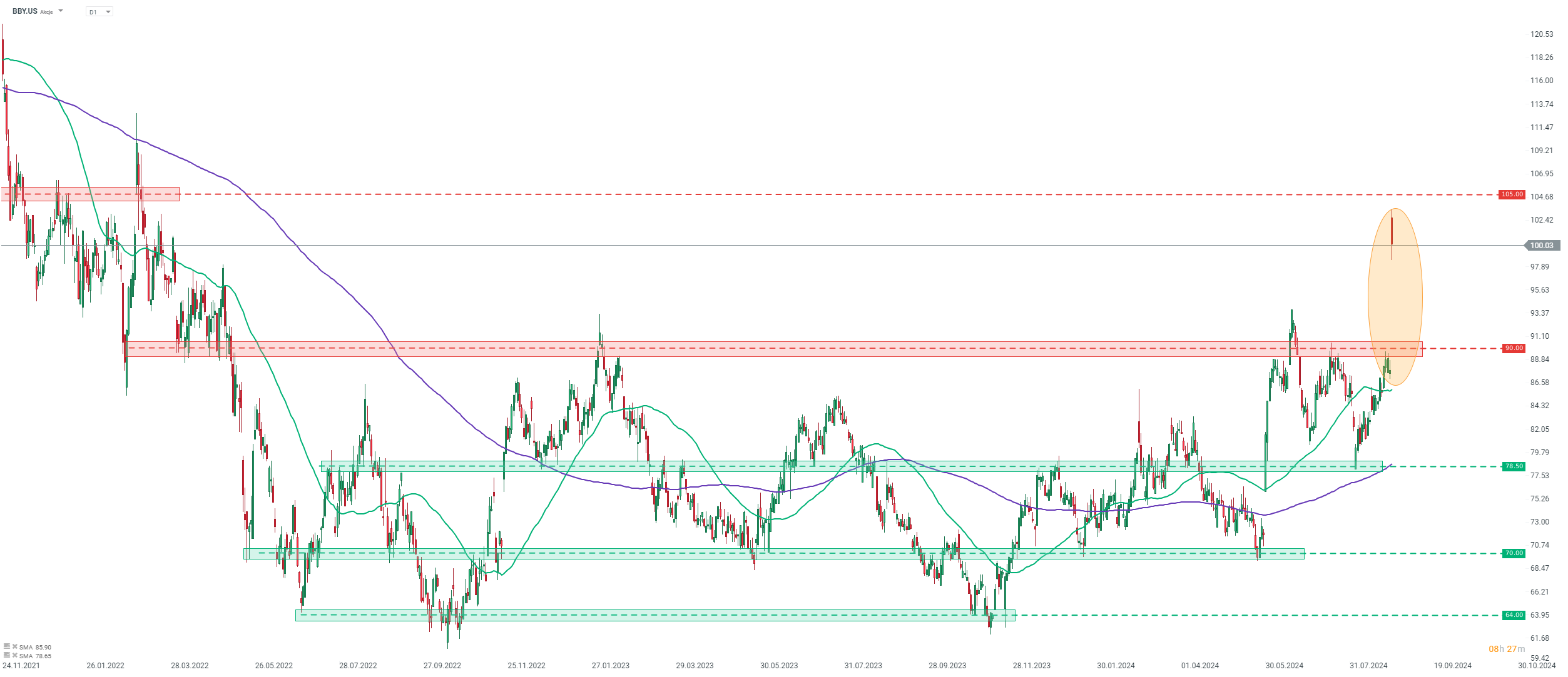Best Buy (BBY.US) begann den heutigen Handel mit einer massiven Kurslücke nach oben. Das Unternehmen meldete einen Umsatzrückgang im zweiten Quartal, der jedoch geringer ausfiel als erwartet, während der Gewinn stieg. Außerdem erhöhte Best Buy die Prognose für den Gewinn pro Aktie für das Gesamtjahr. Die Aktie eröffnete auf dem höchsten Stand seit März 2022 und die nächste Widerstandszone befindet sich im Bereich von 105 $. Quelle: xStation5 von XTB