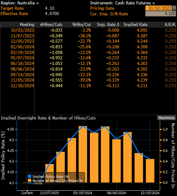 Von über 20 von Bloomberg befragten Ökonomen erwartet nur einer, dass die Reserve Bank of Australia morgen eine Zinserhöhung um 25 Basispunkte vornehmen wird. Andere erwarten, dass die RBA die Zinssätze unverändert belässt und der offizielle Leitzins bei 4,10% bleibt. Auch die Geldmärkte rechnen nicht mit einer Änderung, allerdings ist eine Zinserhöhung um 25 Basispunkte für das erste Quartal 2024 eingepreist.