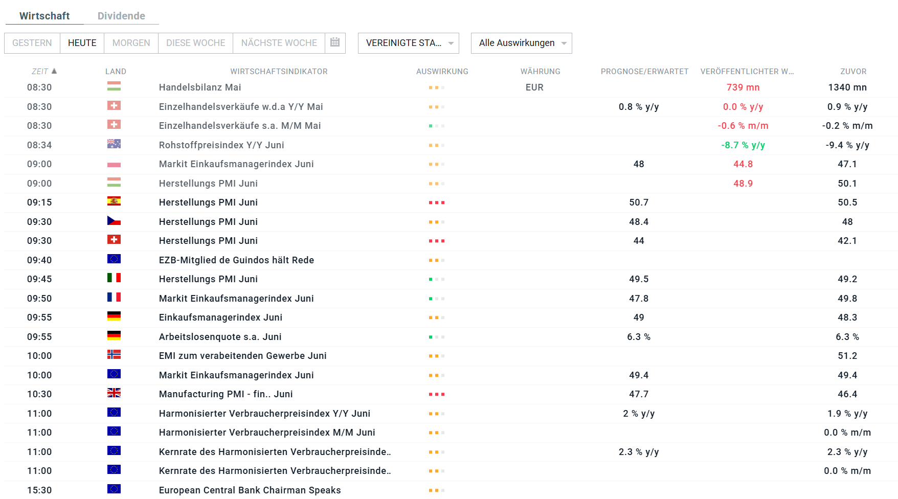 Der heutige Makrokalender konzentriert sich auf die PMI-Daten für die Industrie aus den wichtigsten Volkswirtschaften der Welt. Um 11:00 Uhr werden auch die VPI-Daten aus der Eurozone und die JOLTS-Daten aus den USA (16:00 Uhr) veröffentlicht. Das jährliche Forum der Europäischen Zentralbank in Sintra dauert noch an. Heute werden wir Erklärungen von Andrew Bailey (BoE), Christine Lagarde (EZB), Jerome Powell (FED) und Kazuo Ueda (BoJ) hören. 15:30 Uhr MESZ.