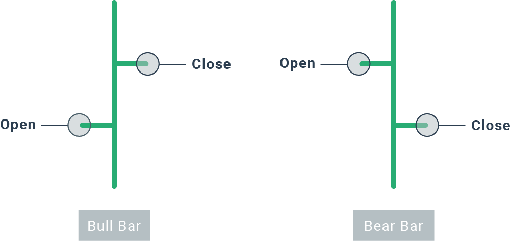Es gibt zwei Arten von Balken, die im Chart dargestellt werden können. Eine gängige Methode zur Klassifizierung der vertikalen Balken ist es, die Beziehungen zwischen den Eröffnungs- und Schlusskursen in einem einzigen Zeitintervall als Bullen- (steigend) oder Bär-Balken (fallend) darzustellen, wie nachstehend gezeigt: