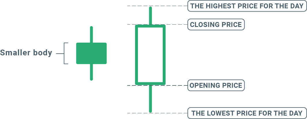 Candlestick-Charts ähneln den Bar-Charts, sie stellen die gleichen Informationen dar, sind aber optisch leichter verständlich. Wie bei den Bars beziehen sich die Candlesticks auf einen Hoch-bis-Tief-Bereich mit Eröffnungs- und Schlussniveaus. Der höchste Kurs wird durch einen oberen Schatten angezeigt, während der niedrigste Kurs durch den unteren Schatten dargestellt wird. Je länger der Kerzen-Körper ist, desto intensiver ist der Kauf- oder Verkaufsdruck. Das bedeutet: Je länger der Körper ist, desto größer war die Kursänderung. Im Gegensatz dazu zeigen kurze Candlesticks wenig Kursbewegung und stellen eine Konsolidierung dar (einen Zeitraum, in dem der Markt ruhig bleibt).
