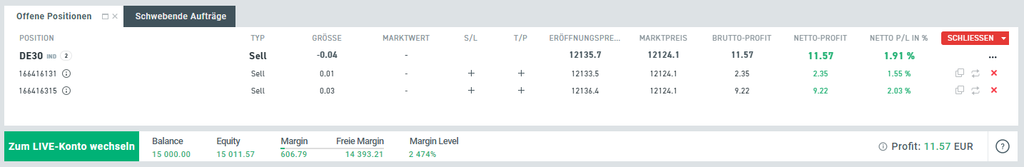 Wenn Sie mehrere Positionen im gleichen Instrument geöffnet haben, werden diese zusammengefasst. Durch einen Klick auf das Symbol des Instruments, werden alle einzelnen Positionen in diesem Instrument untereinander angezeigt.