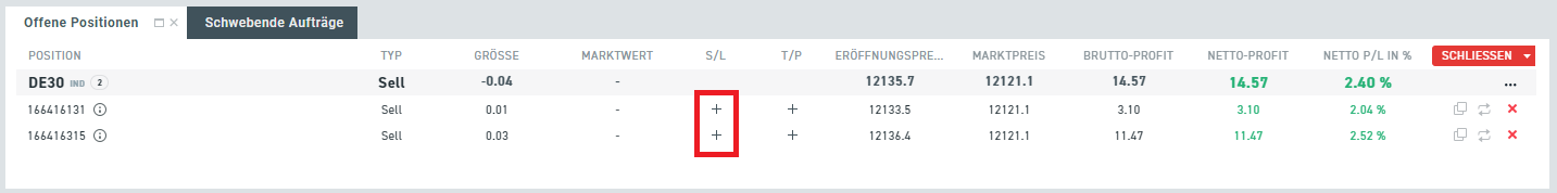 In der Registerkarte der offenen Positionen können Sie Stop-Loss- und Take-Profit-Aufträge verwalten.